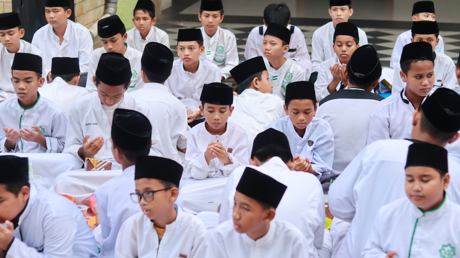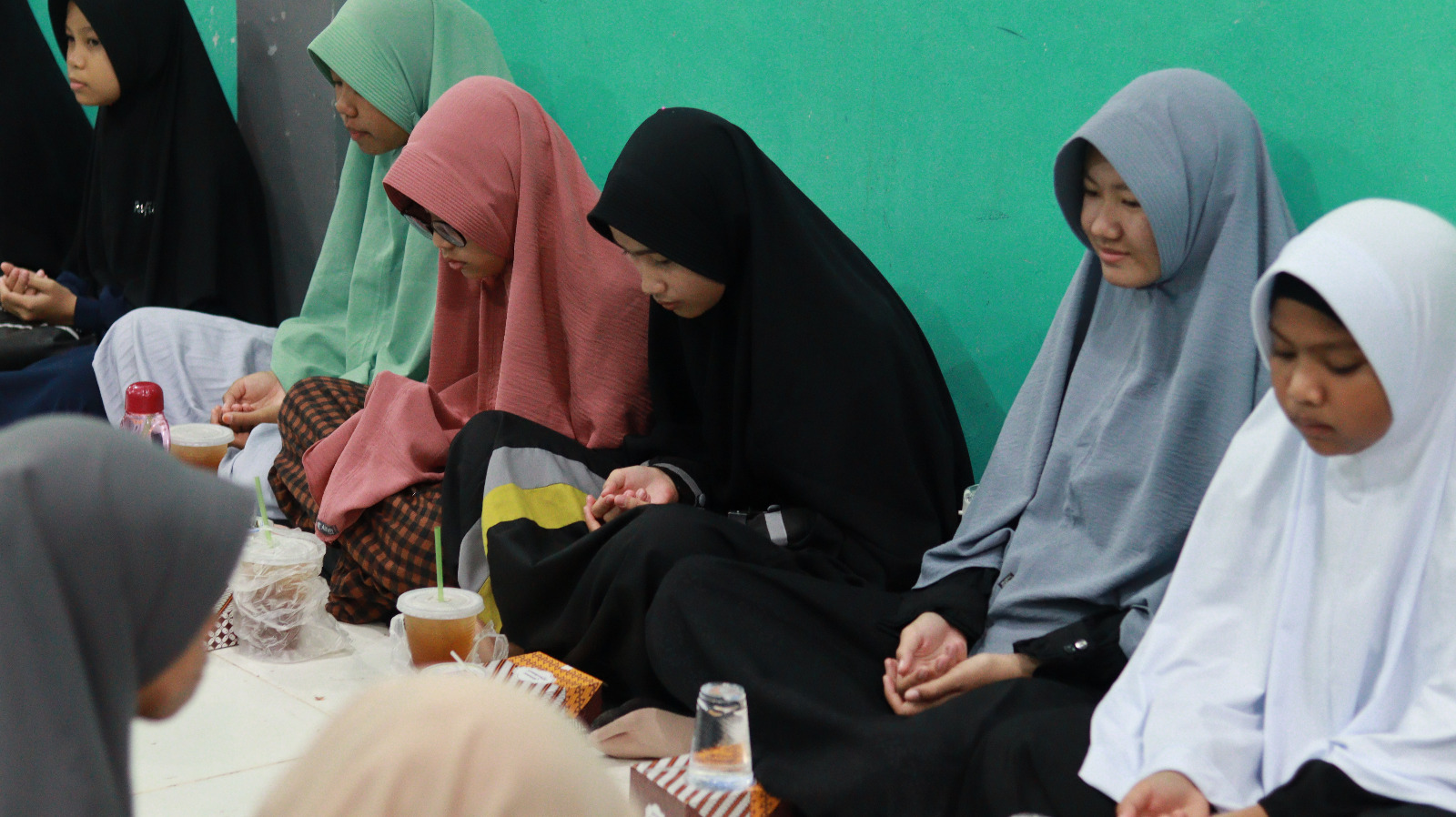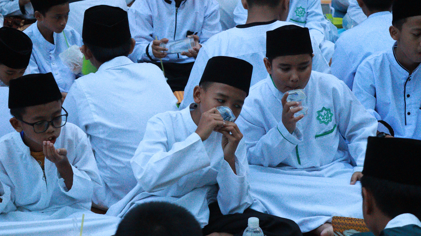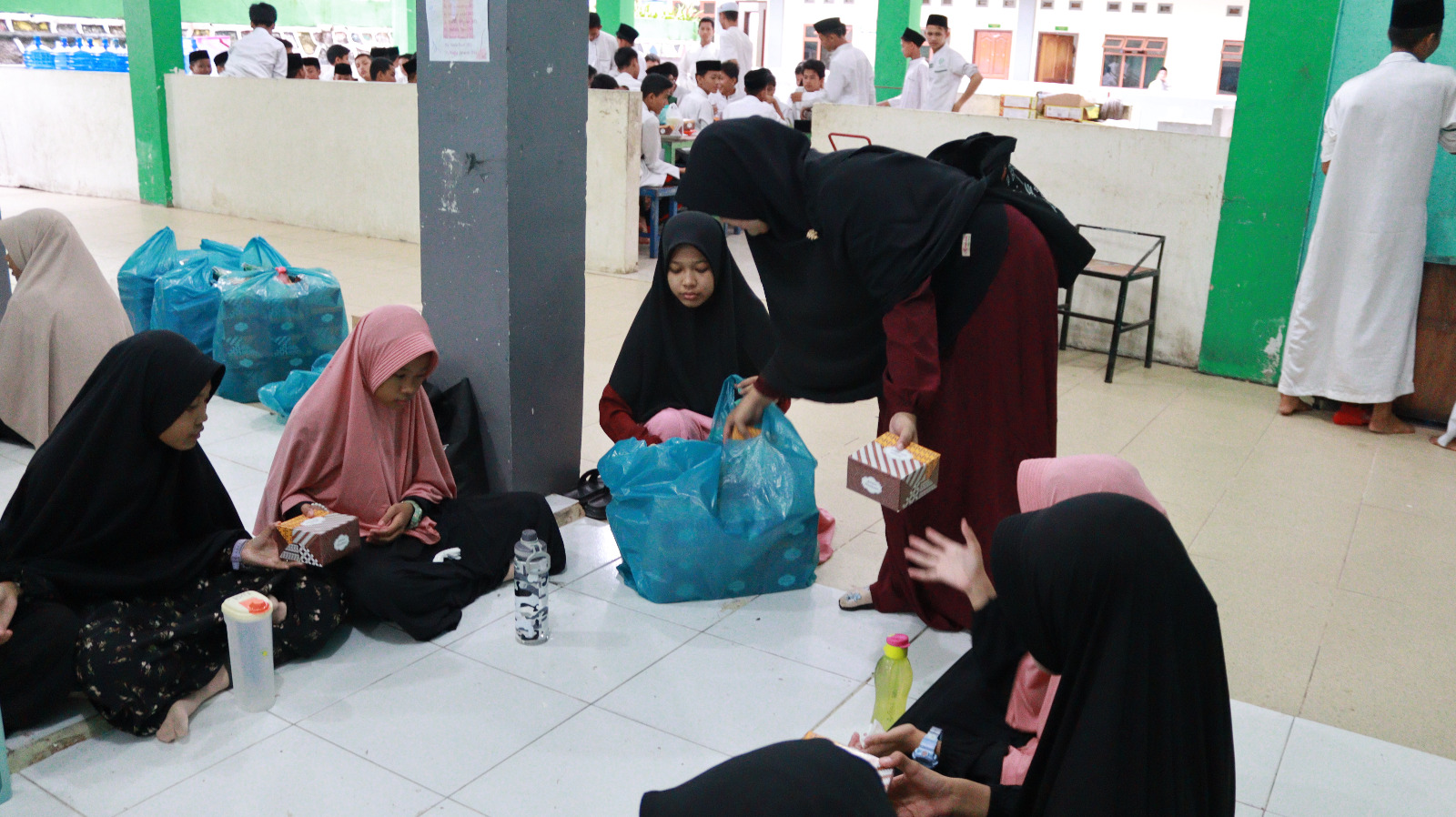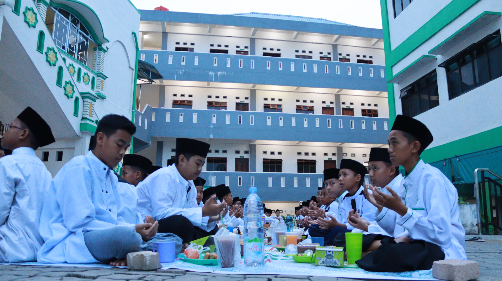 Tampak wajah sumringah dan senyum lebar yang tak dapat disembunyikan terpancar dari setiap santri saat melihat menu spesial di hadapan mereka sambil melafalkan do'a berbuka puasa yang di pandu oleh wali asuh pondok.
