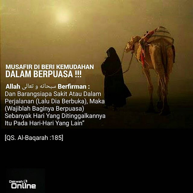 “Barangsiapa di antara kalian ada yang sakit atau dalam perjalanan (lalu ia berbuka), maka (ia wajib mengganti) sejumlah hari yang ia tinggalkan pada hari-hari lain. Allah menginginkan kemudahan atas kalian dan tidak menginginkan kesusahan.”(al-Baqarah: 185)